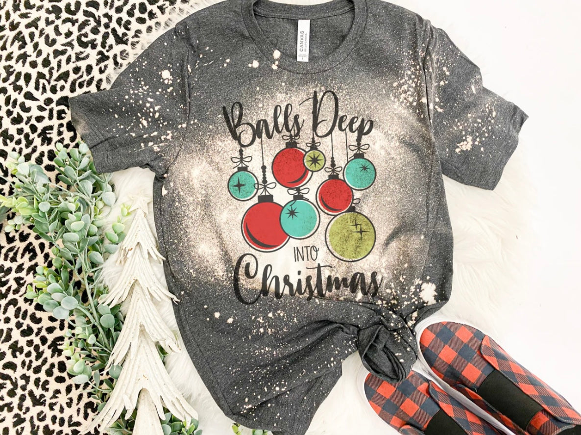 Take the holiday season by storm with the Balls Deep into Christmas Tee! Show off your cheeky humor with this bleached charcoal crew neck unisex shirt. Conquer the chaos of Christmas time in style!