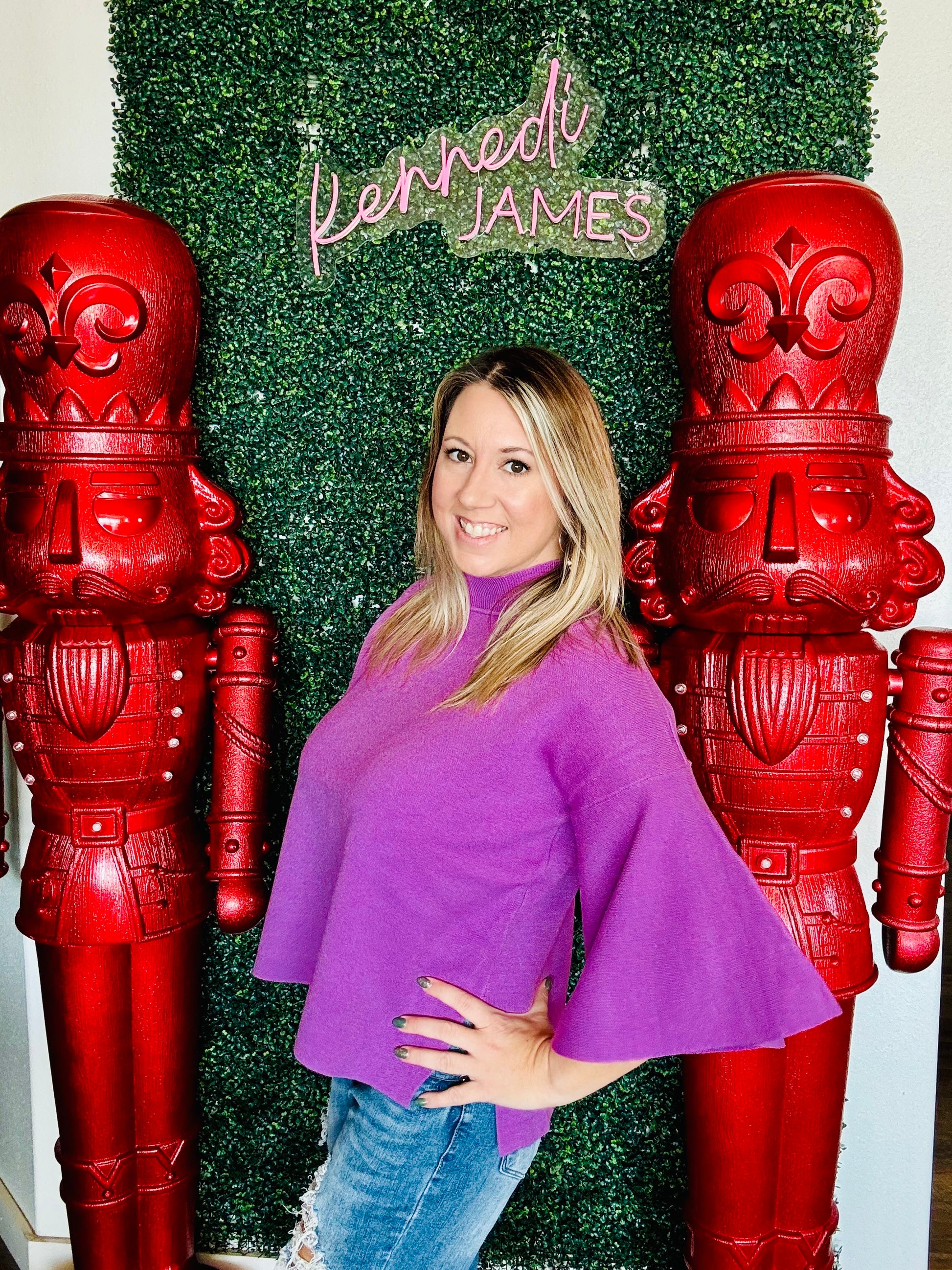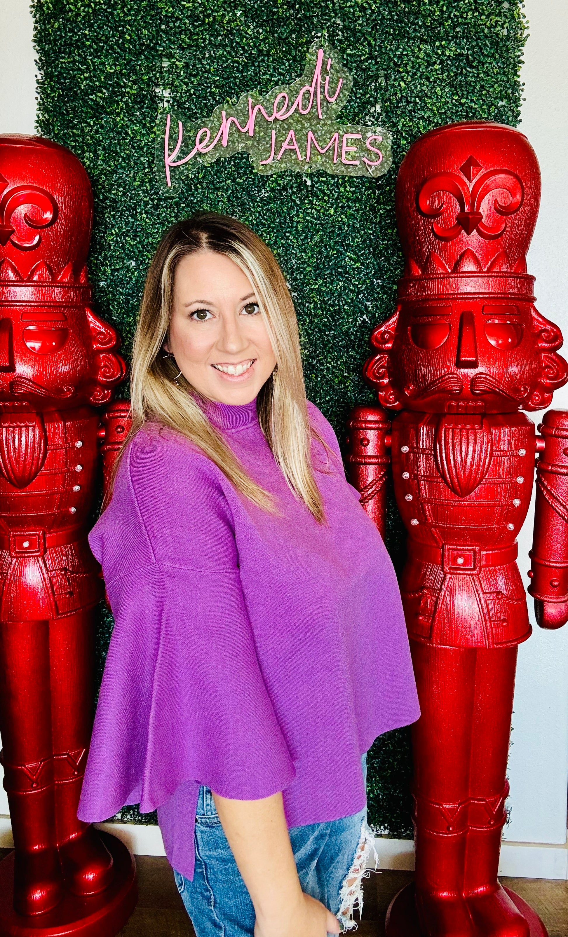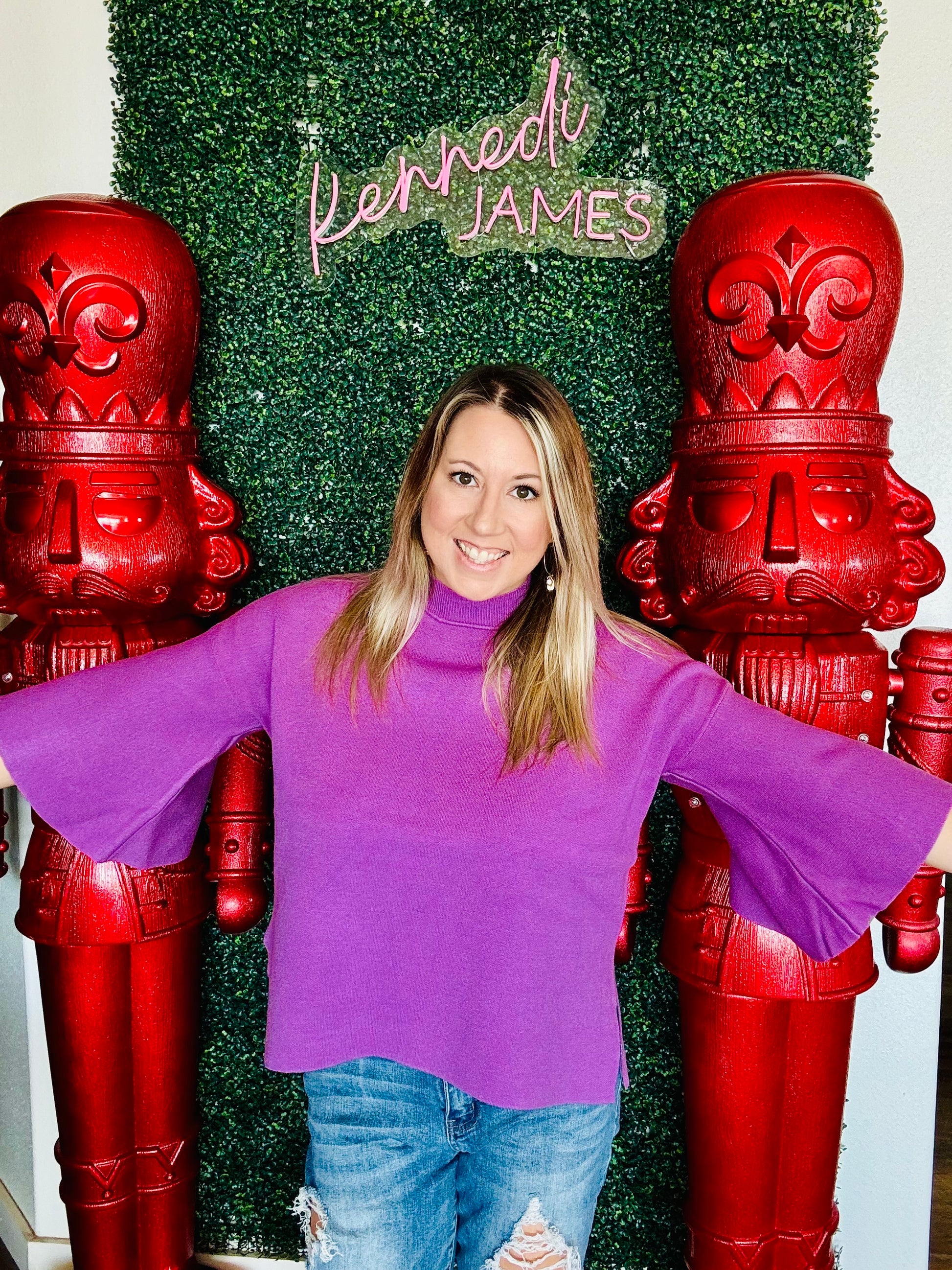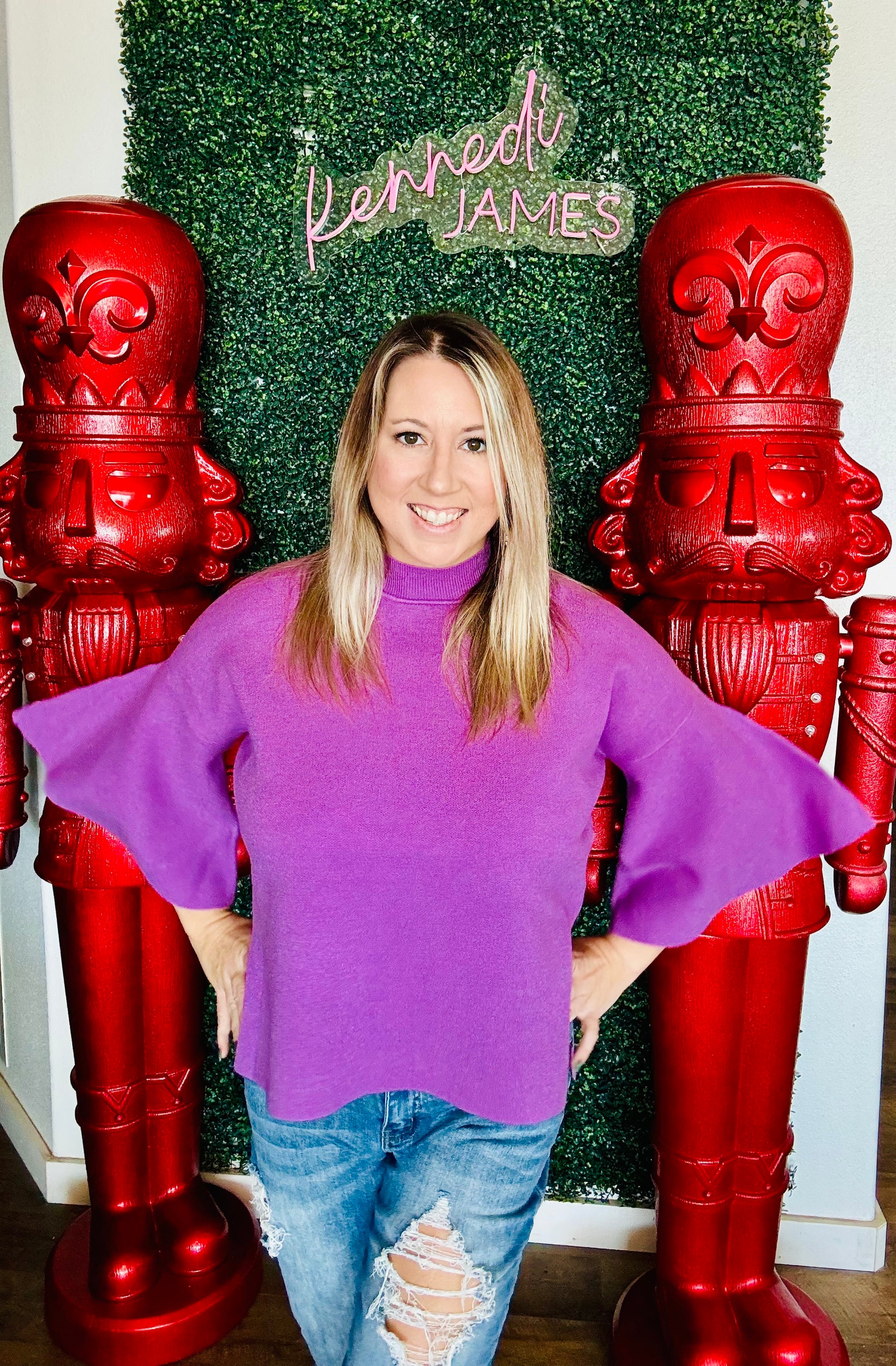 Look stunning and feel confident in this beautiful bell sleeve sweater. Crafted in a bold purple hue, the oversized fit and high neckline flatter all shapes and sizes. Slitted sides add a daring touch, for a one-of-a-kind look! Take risks and step out into the world with style!