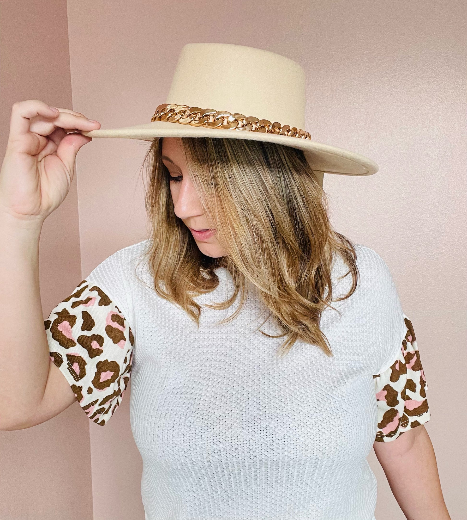 - Cream Felt Hat with Gold Chain Accent