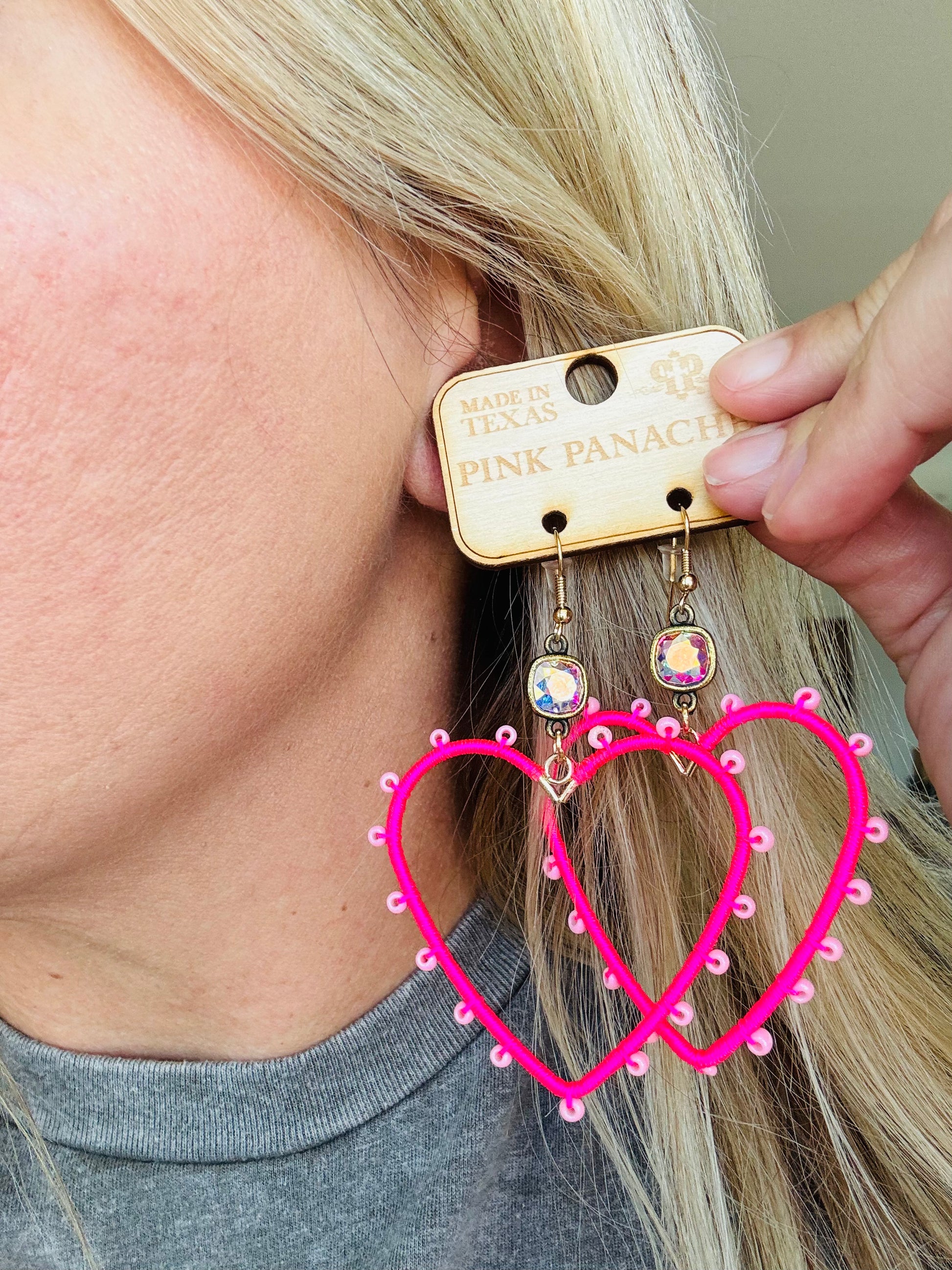 Get ready to turn heads with these Bright Pink Heart Earrings! These fun and flirty earrings feature a bright pink heart with light pink beads, adding a touch of sparkle to your look. Perfect for adding a pop of color and whimsy to any outfit.