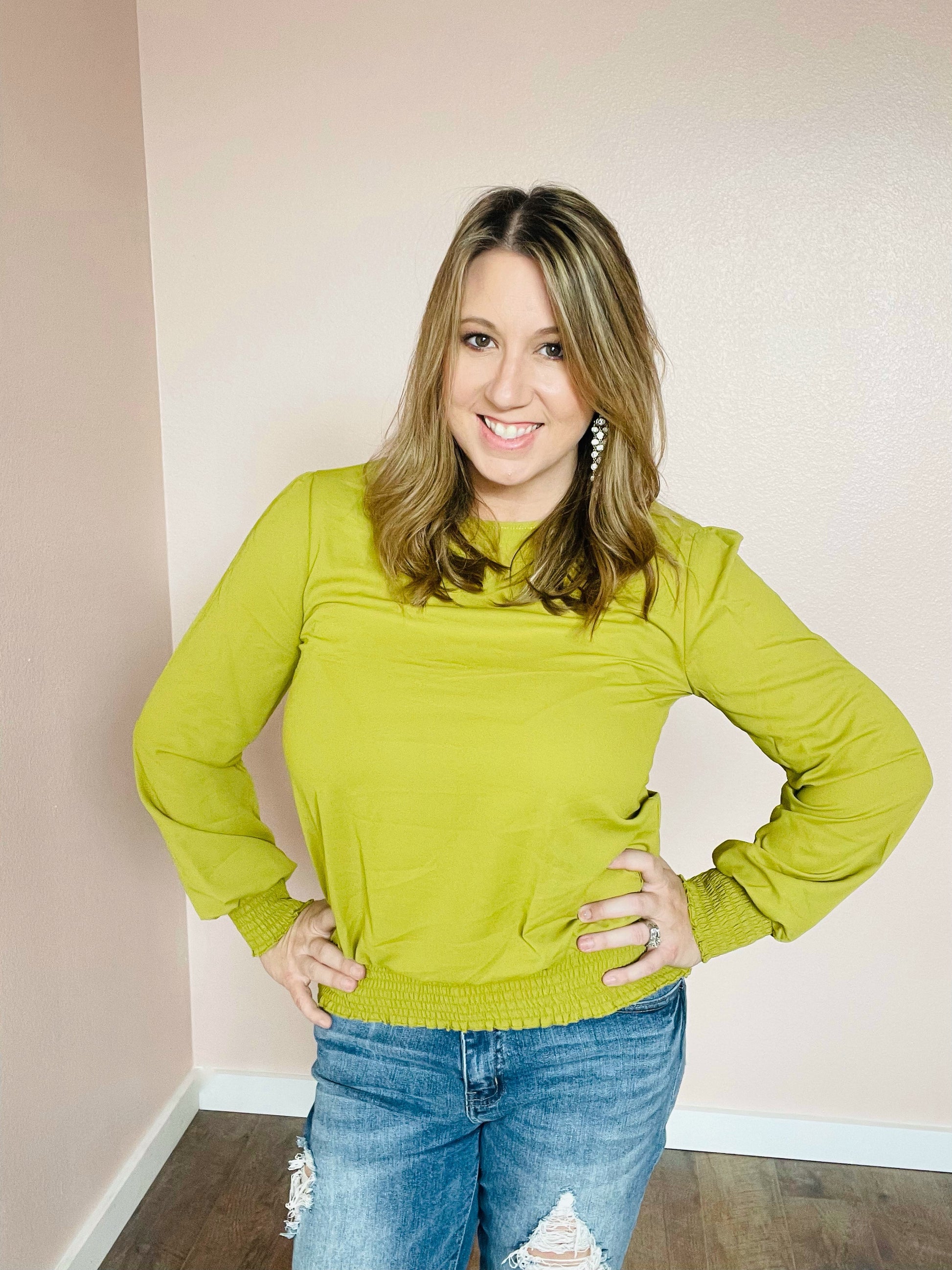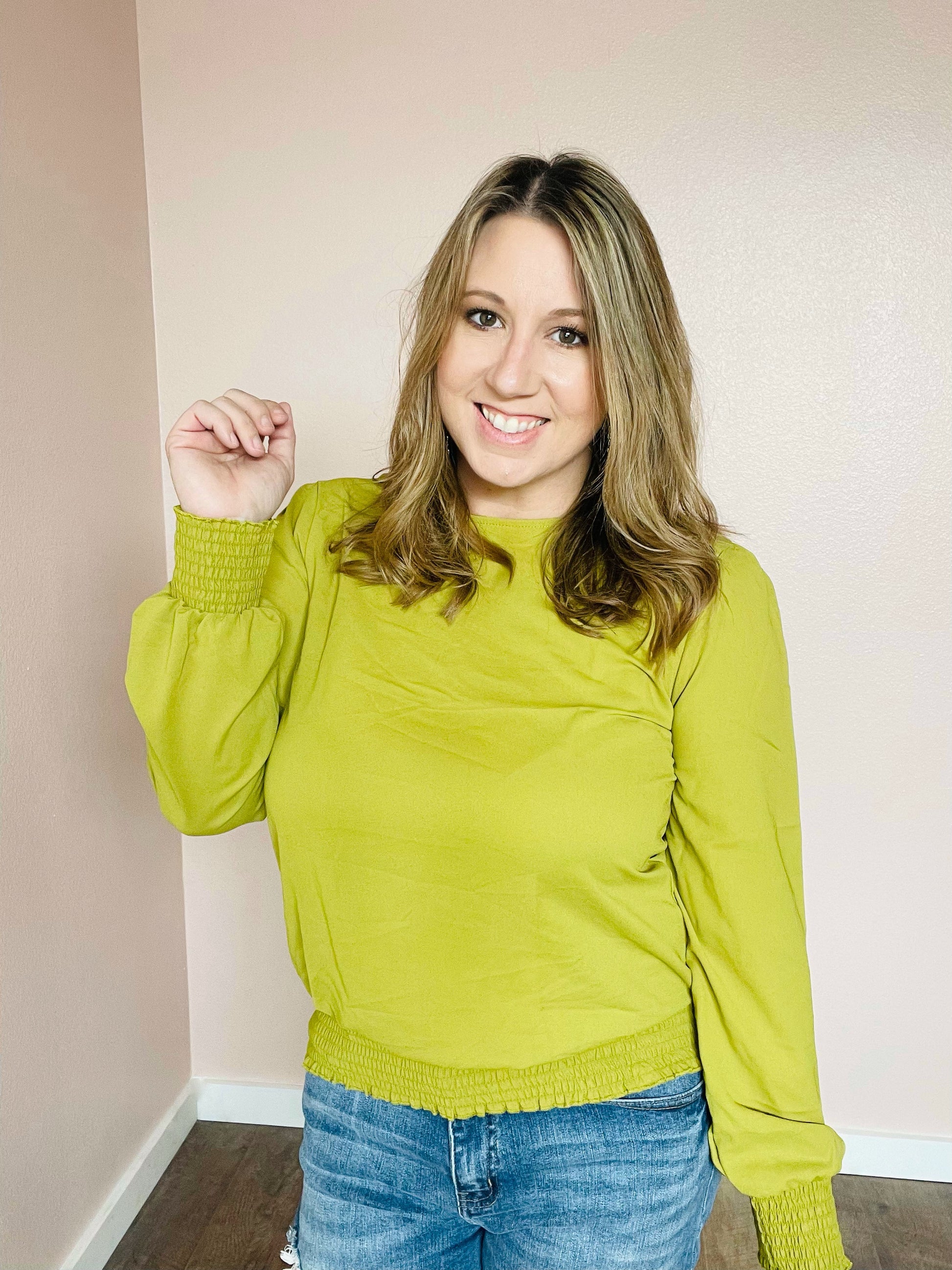 Experience the true beauty of this top in person! The stunning Chartreuse Green hue is complemented by smocking at the waist and cuffs, as well as a button clasp on the back neckline. The loose fit allows for comfort and style in both the body and arms.