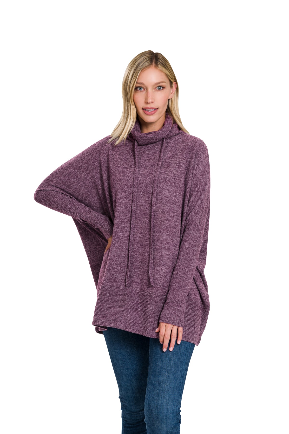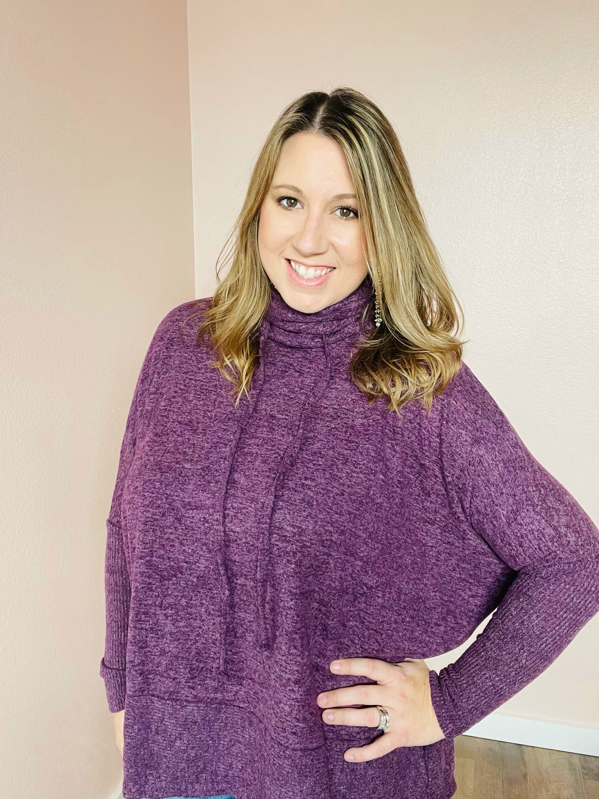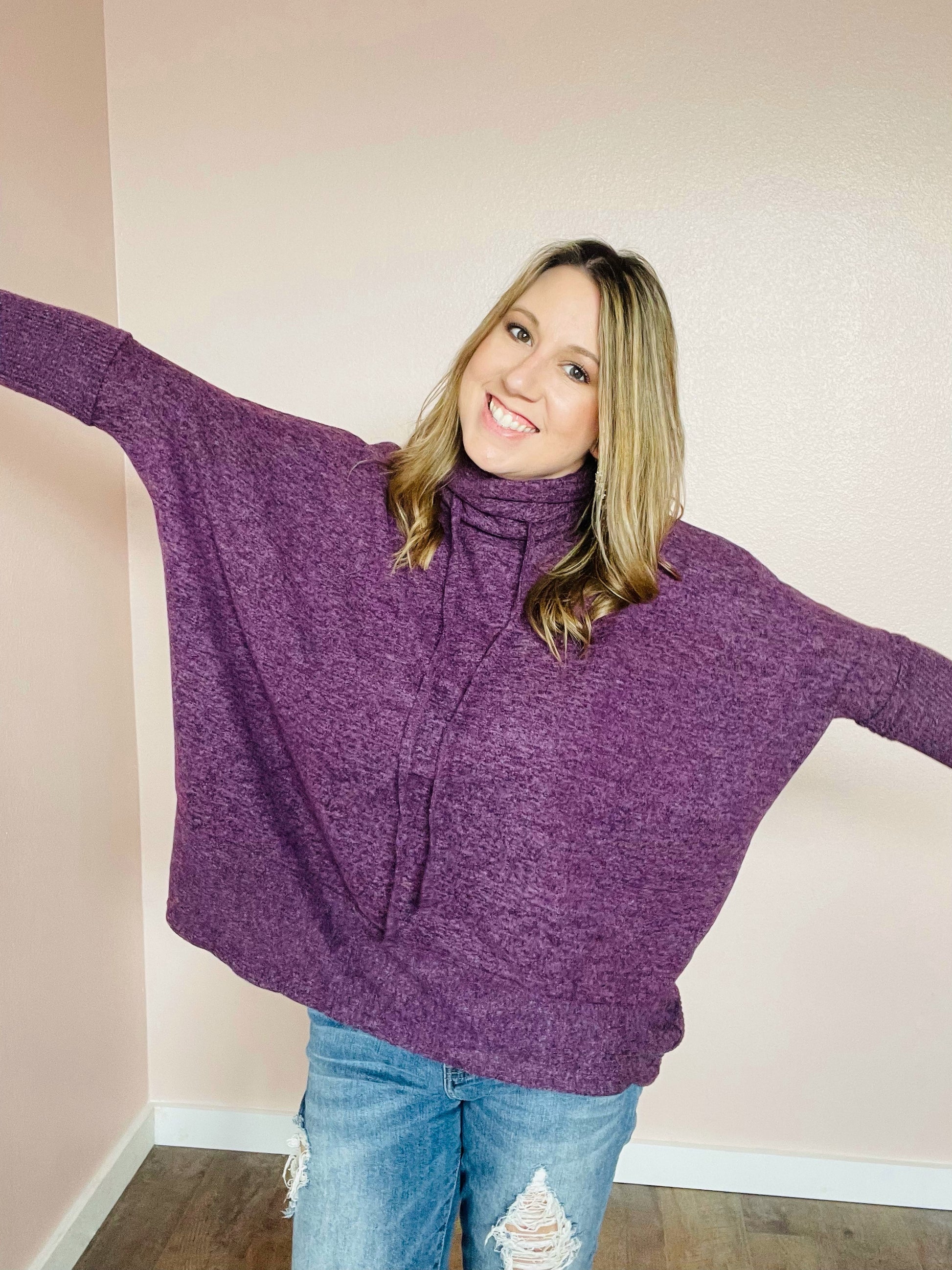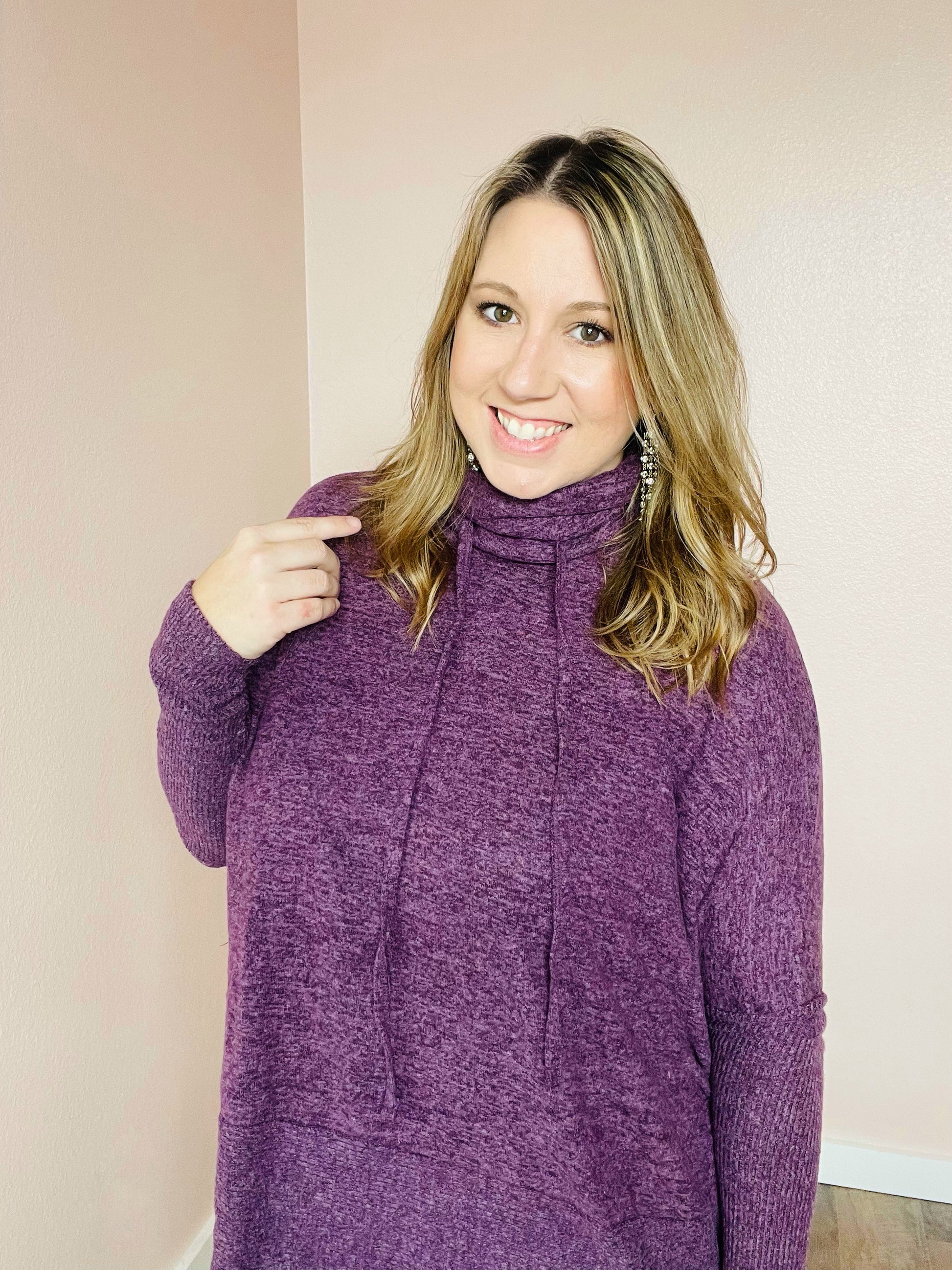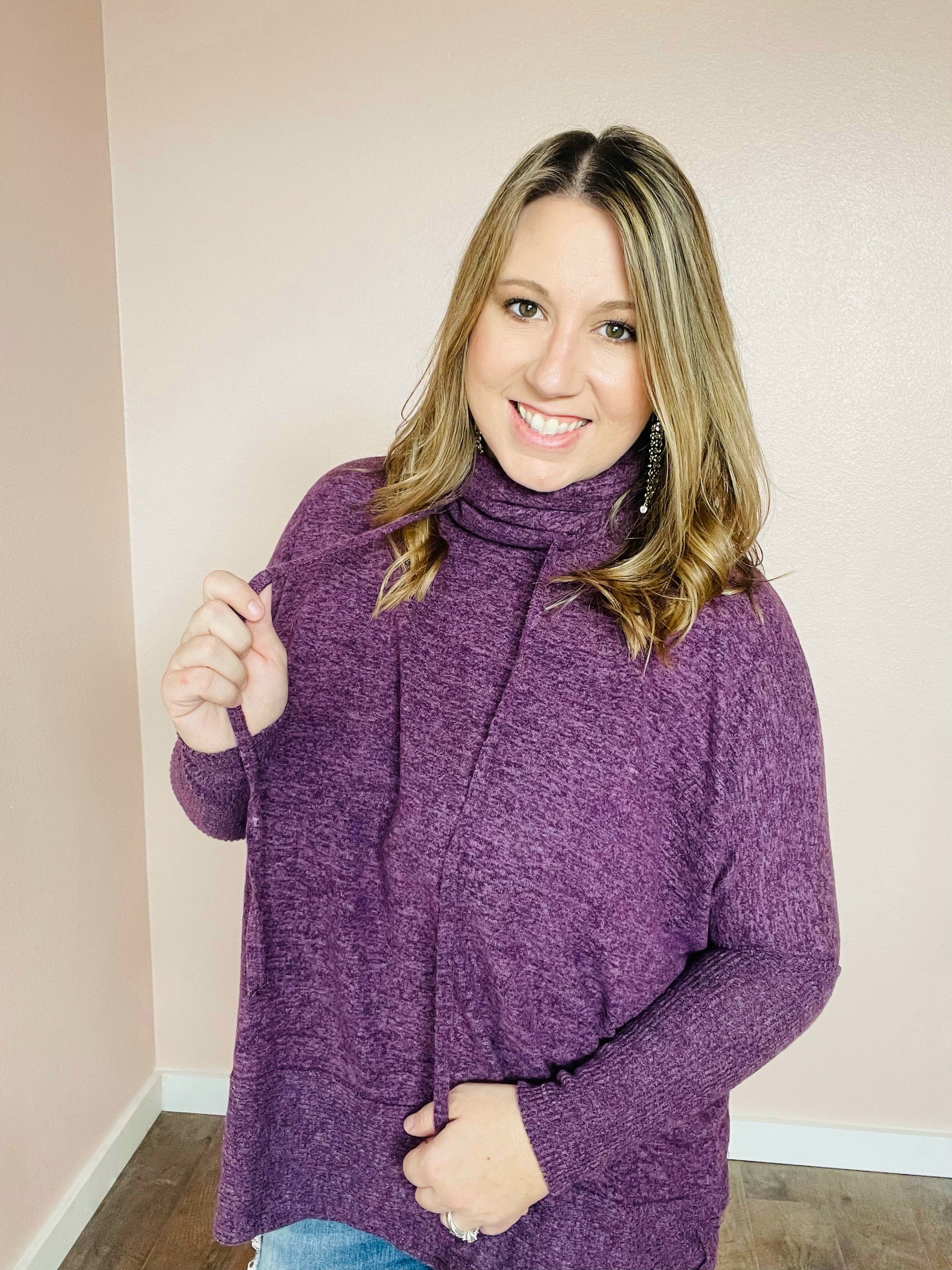 This top is light as a feather and soft as a cloud, making it perfect for cooler temperatures. With its playful cowl neck and vibrant purple hue, it's a must-have for any fun-loving fashionista in search of comfort and style!