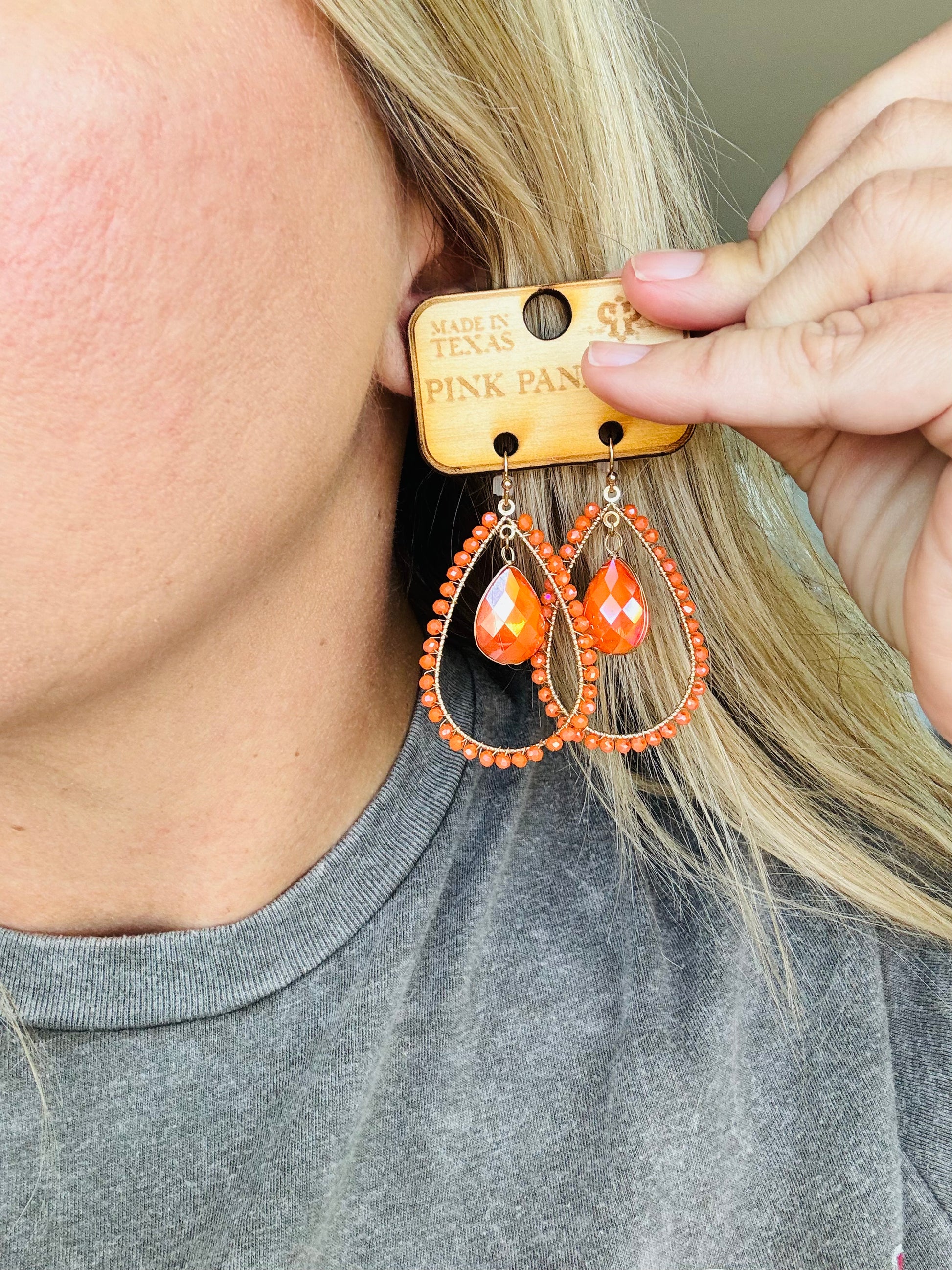 These bright orange beaded teardrop earrings are the perfect accessory for adding a pop of color to any fall outfit. Whether you want to make a statement for Halloween, Thanksgiving, or simply love the color orange, these earrings will add a touch of elegance with their orange jewel detail.