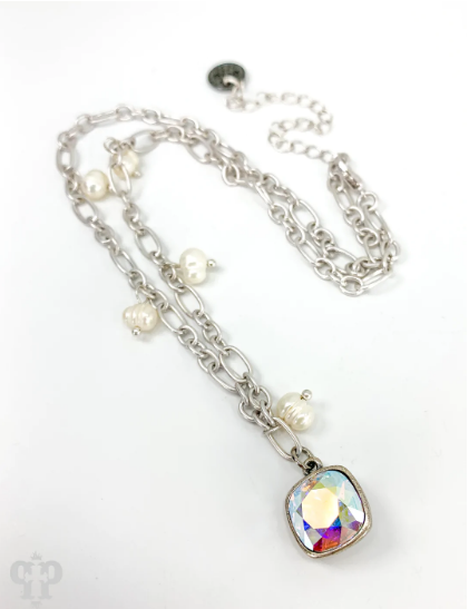 Experience the true beauty of this necklace in person. The delicate chain is adorned with elegant pearls, and the mesmerizing jewel features an array of stunning colors that are sure to attract compliments.