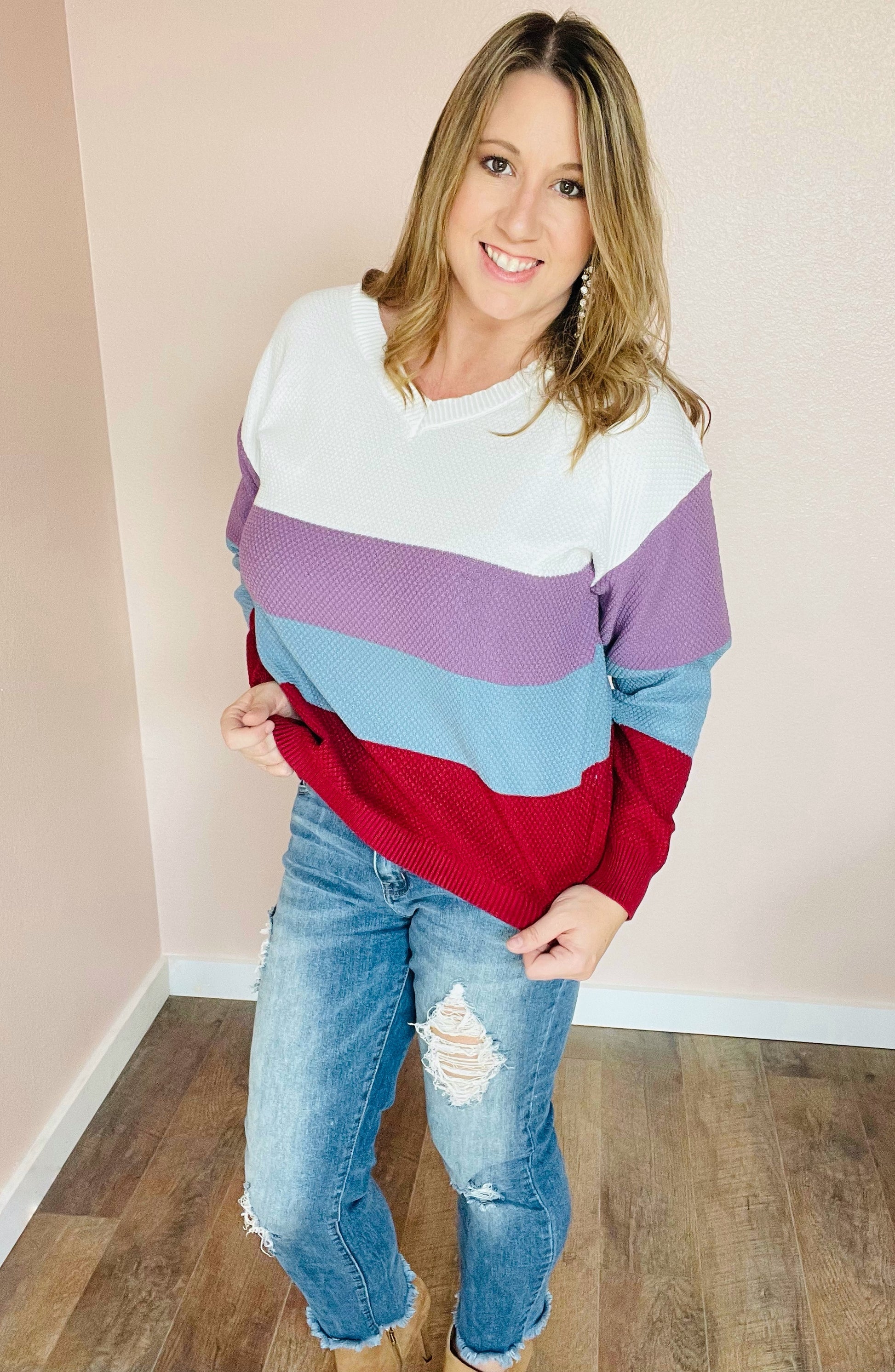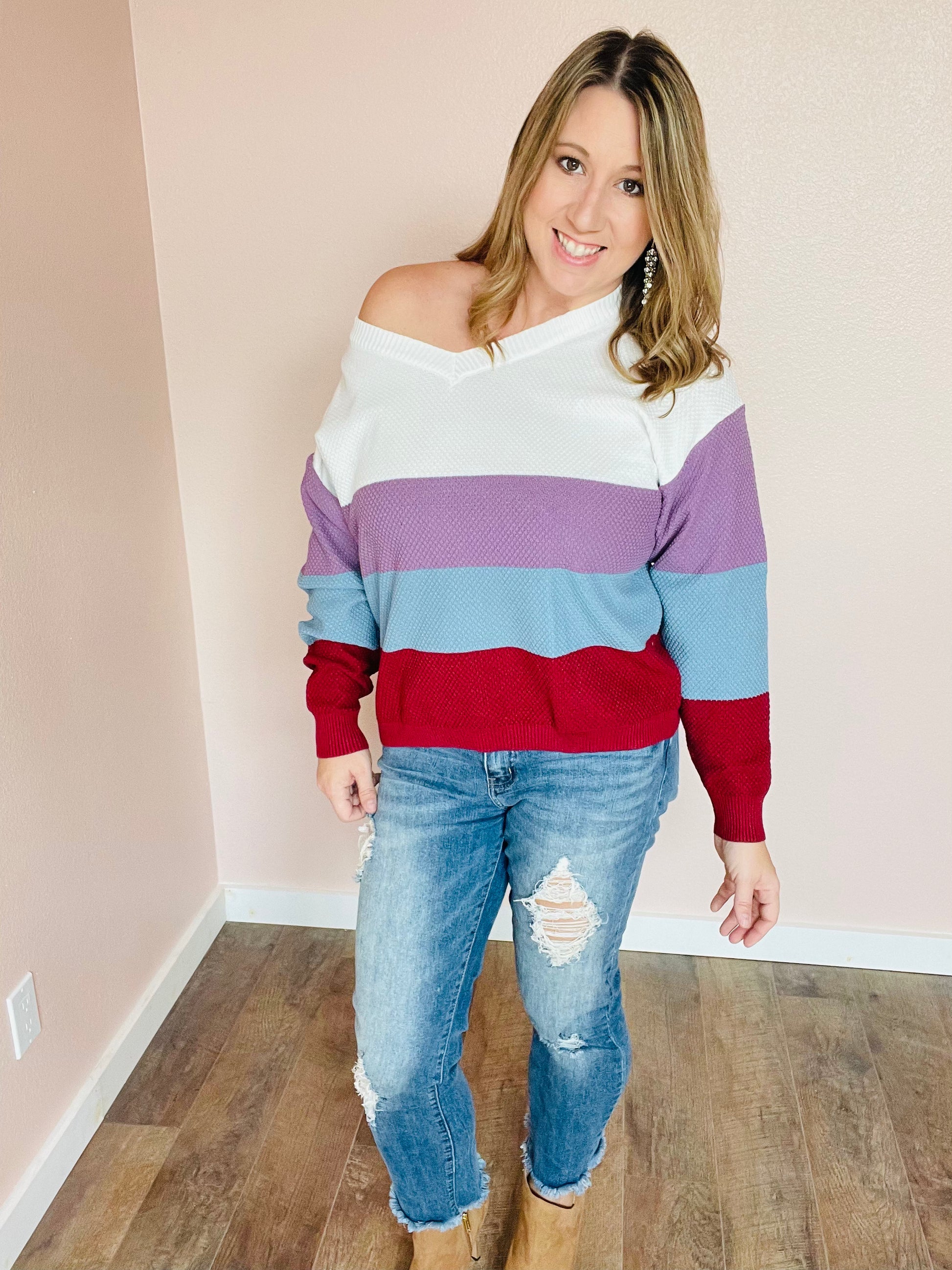 - White, Purple, Blue and Maroon Coloblock Slouchy Sweater