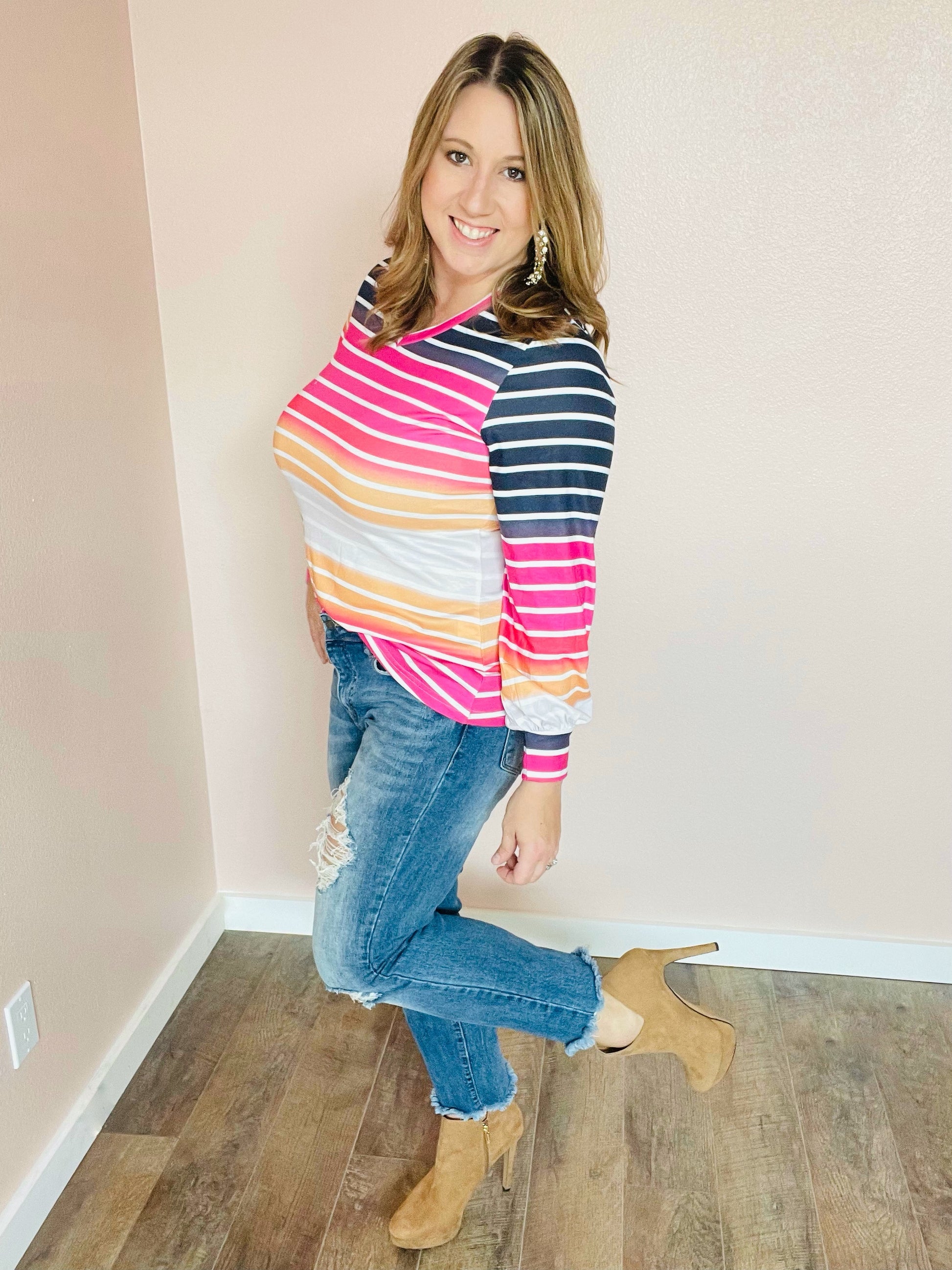 Unleash your inner fashionista with our Sunset V Neck Long Sleeve Top! With striking ombre colors of black, orange, pink, and white, you'll be sure to turn heads. Perfect for any season, this lightweight top features trendy stripes for added flair. Get ready to stand out in style!